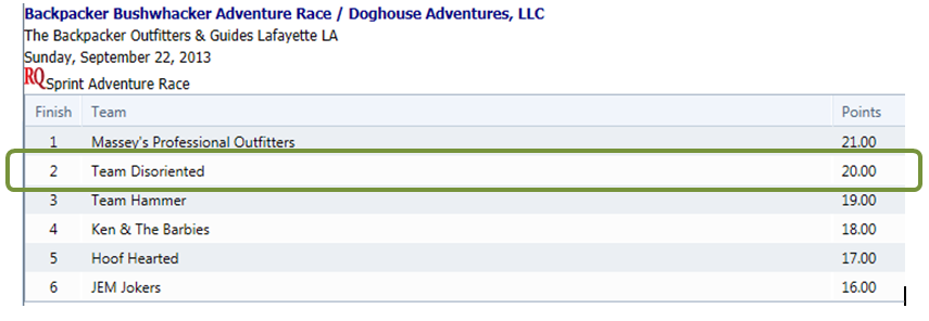 Maybe it was the Arctic Enema or perhaps the Electroshock therapy, I’m not sure but something happened during the Tough Mudder that made me want to find another event that would provide that same kind of thrill and physical challenge. I knew that I wanted something team-based that my wife and I could do together and I wanted it to be adventurous, but not too adventurous. I don’t mind a little thrill but I want to keep my shorts clean. So, we looked into Adventure Racing and decided to sign up for the first one closest to us, the 2013 Backpacker Bushwhacker in Lafayette, LA. Stu, always up for a challenge, completed our 3-person coed team. This was to be our first adventure race. We weren’t quite sure what to expect, but we had a kick-ass logo and team shirts and that’s all one really needs.