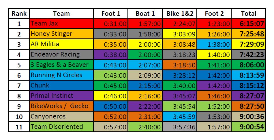 In conclusion, I was really pleased with the way the team performed. We stayed better hydrated and fueled during the entire race. We didn’t capsize. We pushed pretty hard throughout, except when we got chatty with the other racers, and some of our navigation was pretty decent. Below is a capture of the split times for the teams above us. Yes, I know, it is a kaleidoscope of colors but take a moment and let your eyes adjust to the rainbow and I think you’ll be able to see what I was trying to capture. Each team has its own color and each section is arranged in order of time (least to greatest). So, Primal Instinct (Purple), finished 8th overall, completed the foot 1 with the 4th best time, Boat 1 with the 9th best time, Bike 1&2 with the 8th best time and Foot 2 with the 7th best time. See, now wasn’t that fun and easy? Team Jax was first in everything but those guys are on crack so I don’t really count them 😉