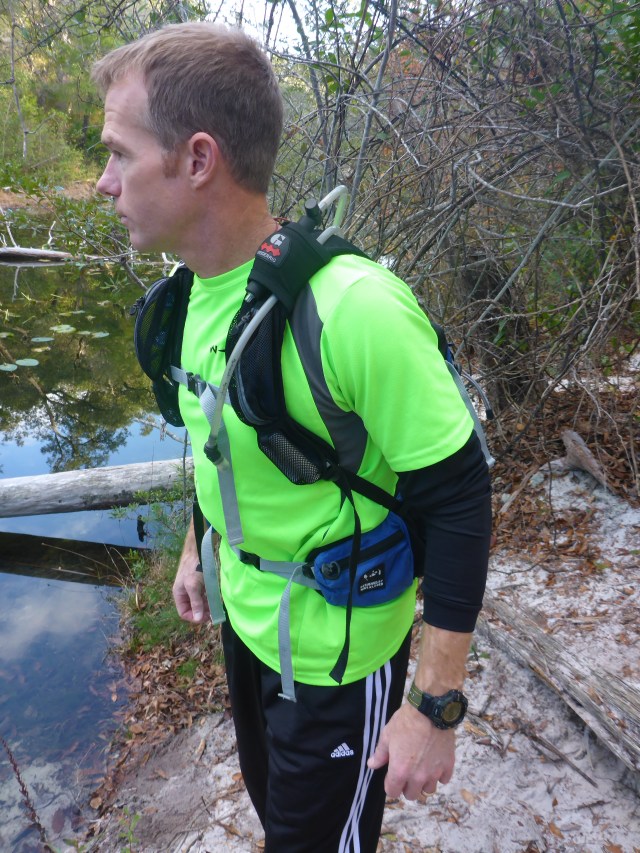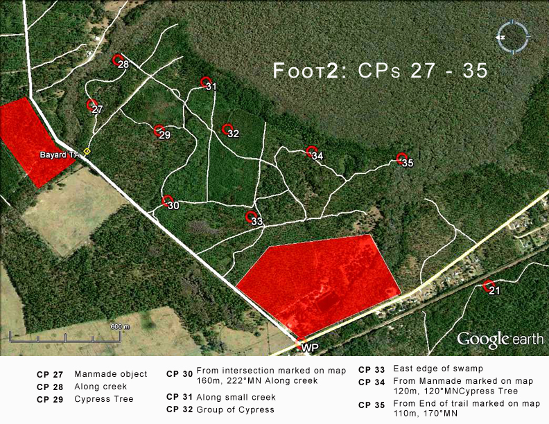 Finishing Boat 1, we were given new maps at the Start/Finish TA and began Bike 1. We first attacked CP16 and I made a big navigational error that cost us another 10 minutes. CP16 was along a utility line easement and I had measured the distance from where the trail branches away from the easement (Point A) rather than where the easement crosses an adjoining trail (Point B). We started down the easement at Point B and so we paced out 300 meters placing us 120 meters shy of CP16. The clue was “Cypress Swamp” which was useless since I couldn’t tell a cypress if I ran into one. Don’t the race guys know there are two types of trees in Florida, pine trees and everything else. Anyway, we almost gave up on CP16 but stuck around a little bit longer and finally found it. I felt relieved as I really wanted to clear all the CPs.